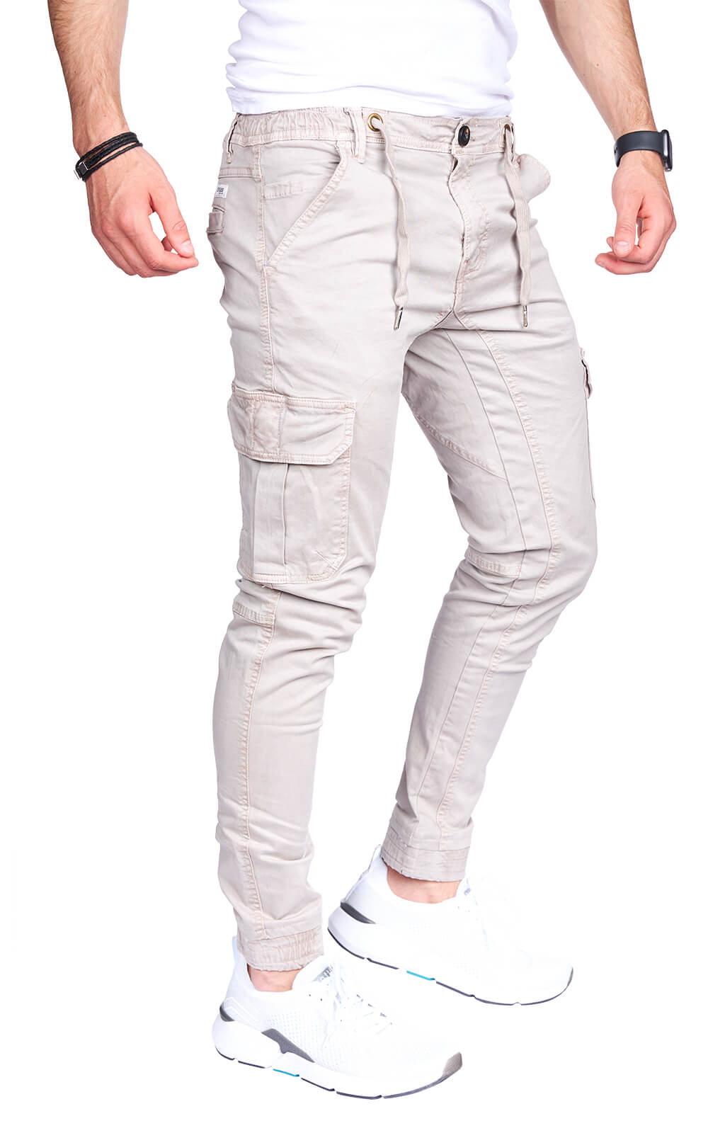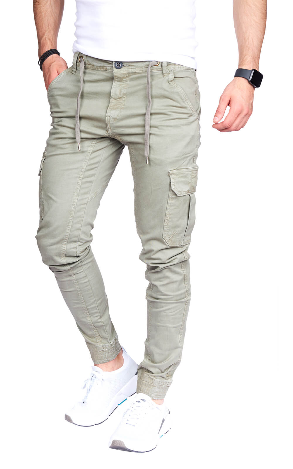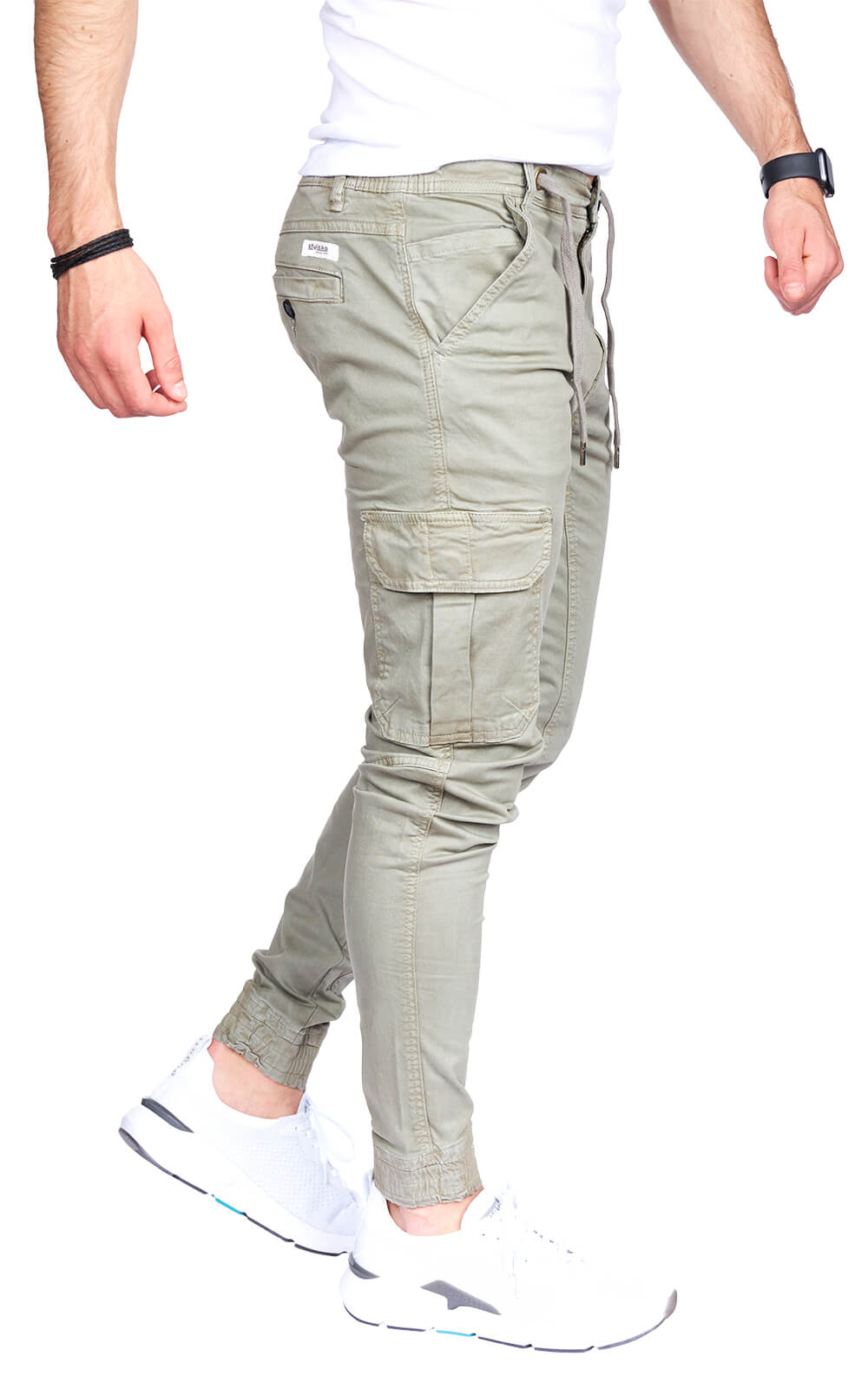 - Zwei Seitentaschen, zwei Cargo-Taschen, zwei Gesäßtaschen mit Patte und verdecktem Klettverschluss sowie ein kleines Münzfach